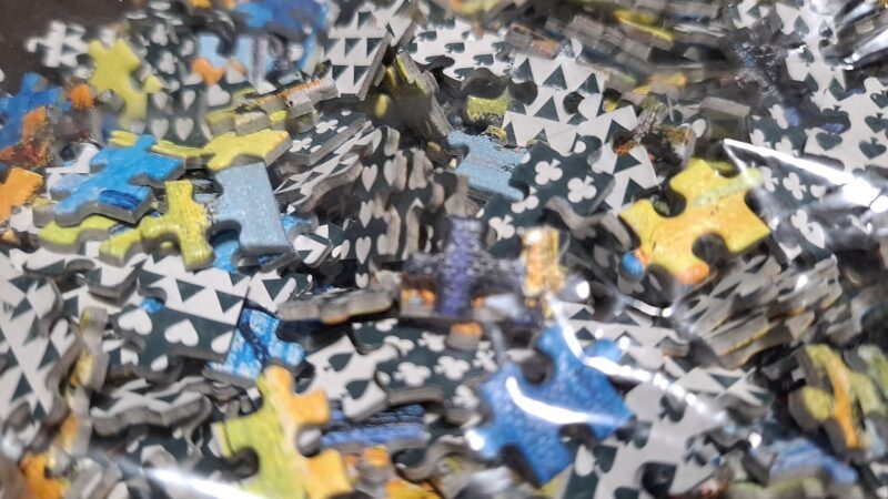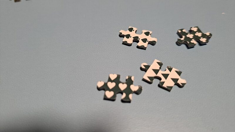 いつもビバリーさんのジグソーパズルを買います。ほかのメーカーでもあるのだろうけど、裏にヒントとなる記号が印刷されていて、4分割したもののどこかがわかるのがよいです。これがないと無理。