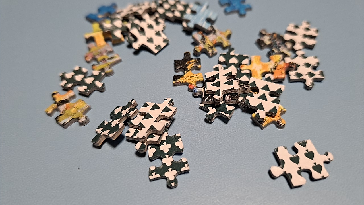 いつもビバリーさんのジグソーパズルを買います。ほかのメーカーでもあるのだろうけど、裏にヒントとなる記号が印刷されていて、4分割したもののどこかがわかるのがよいです。これがないと無理。