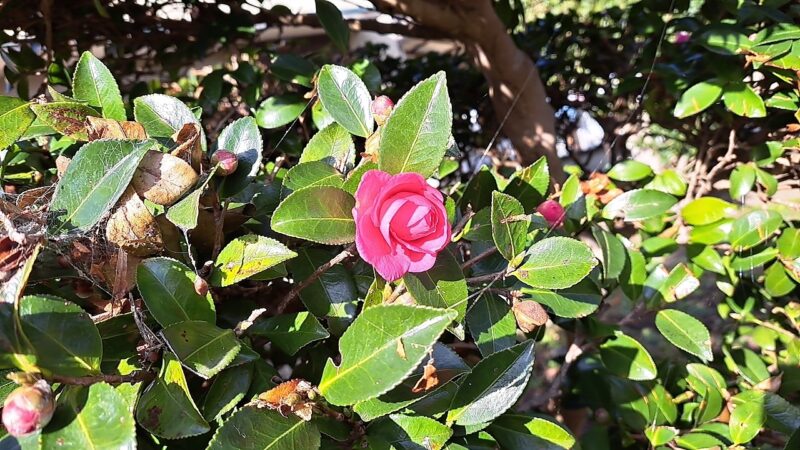クモの巣がすんごいけど。サザンカ(でよいのよね?)。咲き始めました。