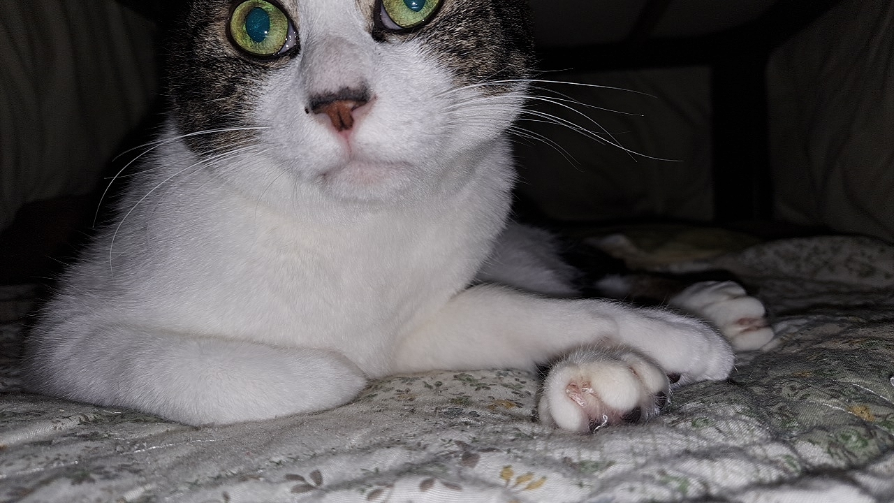 変な写真を載せてしまったので、今日のコタツの中の猫(フラッシュ撮影)。